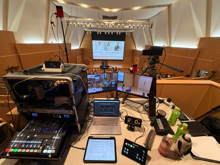 今回は収録のみでしたが、その収録中の映像や、同じカメラの映像を使いつつ、収録とは違うカットの映像を会場のプロジェクターやビジョンに投影する映像送出、映像演出を行うことも増えてきております。イベントや講演会、フォーラム、パーティの映像収録、映像演出をご検討の方は、ぜひお気軽にご相談くださいませ。